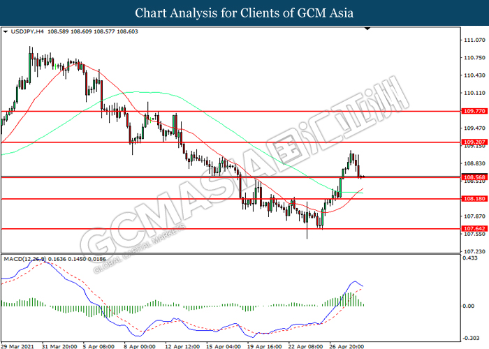 USDJPY, H4: USDJPY was traded lower while currently testing the support level at 108.55. MACD which illustrated diminishing bullish momentum suggest the pair to extend its losses after it successfully breakout below the support level.
