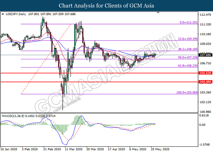 USDJPY, Daily: USDJPY was traded higher following prior rebound from the lower level. MACD which illustrate bullish bias momentum signal suggest the pair to extend its gains toward the resistance level at 108.20.