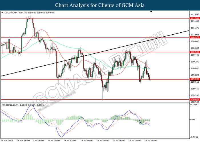 USDJPY, H4: USDJPY was traded lower while currently testing the support level at 109.70. MACD which illustrated increasing bearish momentum suggest the pair to extend its losses after it successfully breakout below the support level.