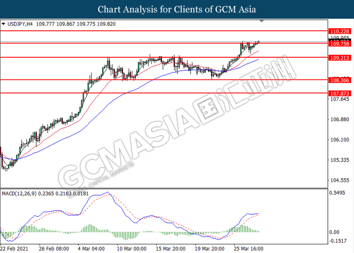 USDJPY, H4: USDJPY was traded higher while currently testing the resistance level at 109.75. However, MACD which illustrated diminishing bullish momentum signal suggest the pair to undergo technical correction in short term.