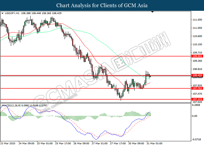USDJPY, H1: USDJPY was traded higher while currently testing the resistance level at 108.45. However, MACD which illustrated diminishing bullish momentum suggest the pair to be traded lower in short-term as technical correction.