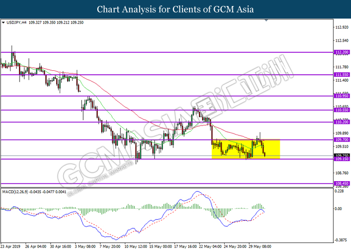 USDJPY, H4: USDJPY was traded lower while currently testing near the support level at 109.15. MACD which illustrate bearish bias signal suggest the pair to extend its losses after successfully breaking below the support level.