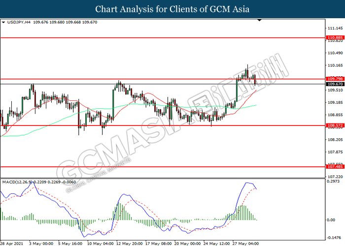 USDJPY, H4: USDJPY was traded higher while currently testing the resistance level at 109.80. However, MACD which illustrated diminishing bullish momentum suggest the pair to be traded lower in short-term as technical correction.