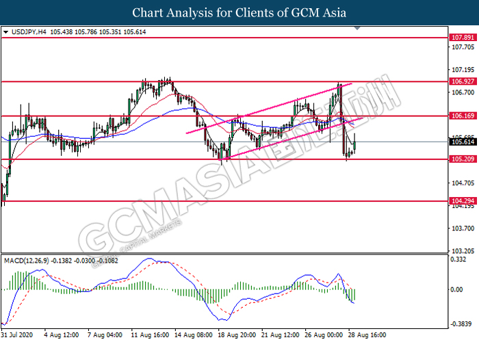 USDJPY, H4: USDJPY was traded higher following prior rebound from the support level at 105.20. MACD which illustrates diminishing bearish momentum suggest the pair to extend its rebound toward the resistance level at 106.15.