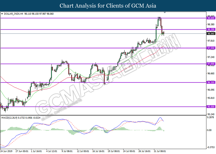 DOLLAR_INDX, H4: Dollar index was traded lower while currently testing near its 20-MA line (green). MACD which illustrate bearish bias signal suggest index to extend its losses after successfully closing below the 20-MA line.