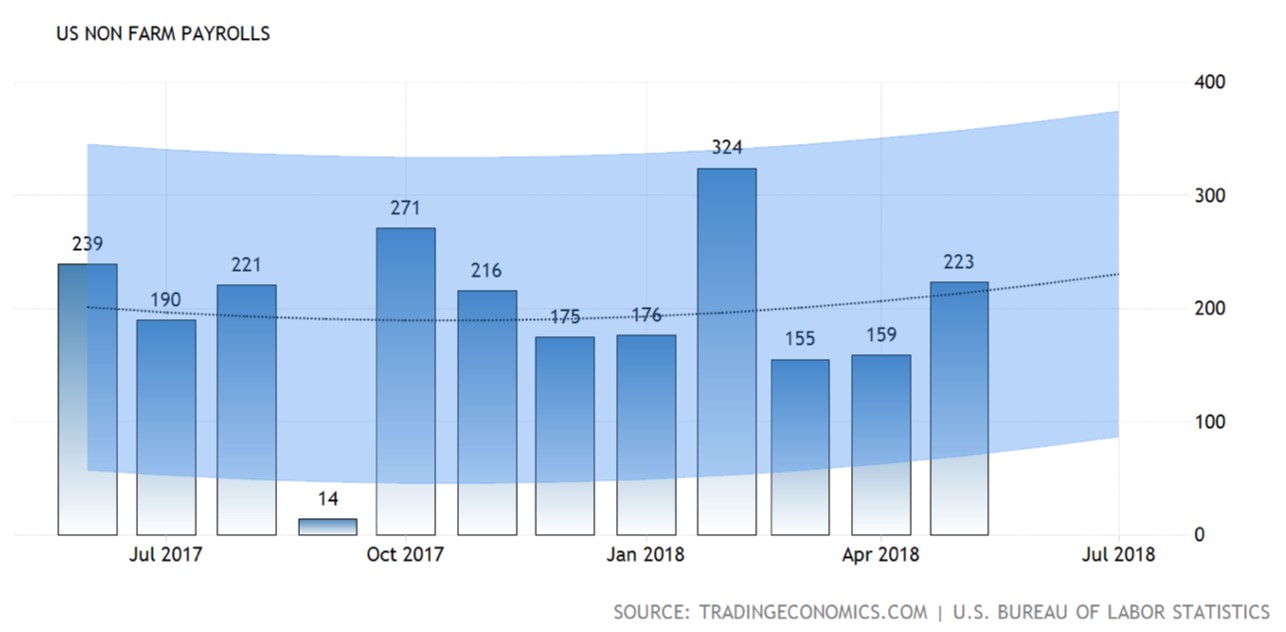 US Nonfarm Payrolls report for the month of May came in at 223,000 jobs.