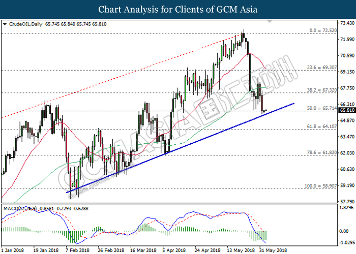 CrudeOIL, Daily: Crude oil price extended its losses following prior retracement from the 60-MA line (green). MACD histogram which illustrate downward signal suggests further bearish bias. However, a breakout from the upward trendline is required to attain further confirmation.