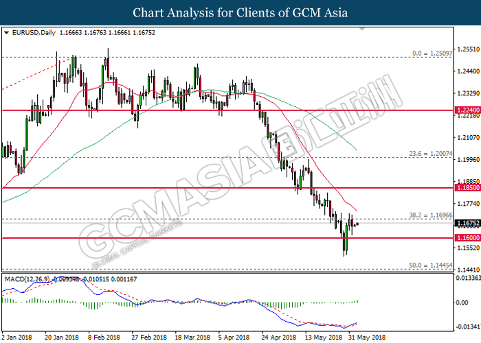 EURUSD, Daily: EURUSD pared its losses following prior rebound while closing above the resistance level at 1.1600. MACD histogram has begin to form an upward signal suggests the pair to extend its gains after closing above the resistance level near 1.1700 and 20-MA line (red).