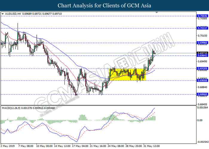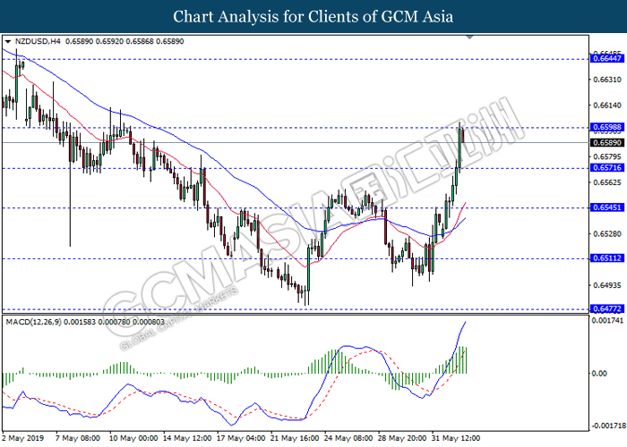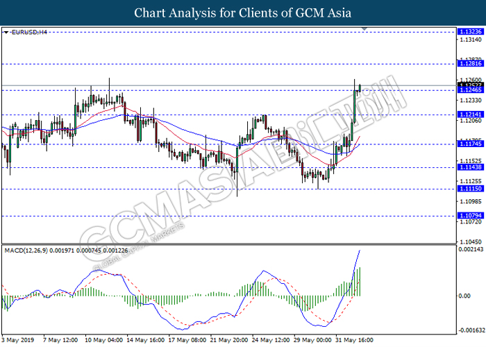 Dollar index which measures its value against a basket of six major currency pairs continues to plunge back to its 97.00 value amid poor manufacturing figure. According to the Institute of Supply Management, US ISM Manufacturing PMI slumped to a two-and-a-half-year low of 52.1, missing economists’ forecast of 53.0 and indicating a slowdown in business activity in the manufacturing sector. Dollar was previously pressured by trade tensions between US and China as well as Mexico, with the released of disappointing data further worsen dollar’s sentiment, causing investors to flee into safe-haven gold and Yen. However, ISM Manufacturing Employment data provided a higher than expected reading, signaling increasing employment activities which might provide a bullish Nonfarm Payroll data this week. At the moment, investors will place their focus on Fed Chairman Jerome Powell speech to wait for further signals in the market. In other news, the euro was able to hold its gains against the dollar yesterday following Eurozone and Germany’s manufacturing data which hit their expectations, lifting worries of further slowdown in Eurozone’s economy. As of writing, dollar index inched higher by 0.03% to 97.04 while pair of EUR/USD was up by 0.09% to 1.1250.