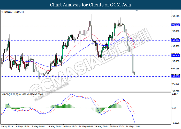 DOLLAR_INDX, H4: Dollar index was traded lower while currently testing near the support level 97.00. MACD which illustrate persistent bearish momentum signal suggest the dollar to extend its losses after it breaks below the support level.