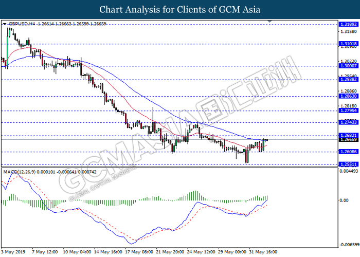 GBPUSD, H4: GBPUSD was traded higher following prior rebound from the support level 1.2610. MACD which display bullish signal suggest the pair to extend its gains towards the resistance level 1.2680.