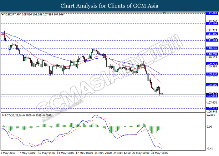 USDJPY, H4: USDJPY was traded lower while currently testing the support level 107.85. MACD which illustrate persistent bearish bias signal suggest the pair to extend its losses after it breaks below the support level 107.85.