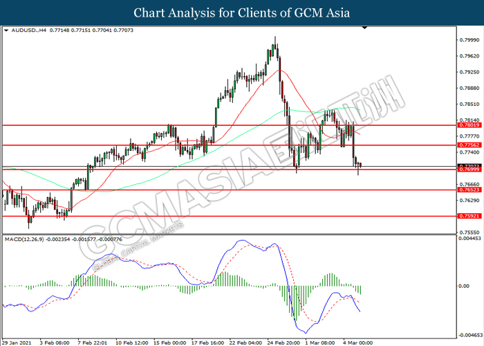 AUDUSD, H4: AUDUSD was traded lower while currently testing the support level at 0.7700. MACD which illustrated increasing bearish momentum suggest the pair to extend its losses after it successfully breakout below the support level.