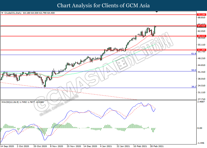 In the commodities market, crude oil price soars 0.56% to $64.33 per barrel as of writing following market continue to digest news of OPEC decision to maintain supply curb. OPEC and its allies agreed to not increase supply in April as they await a more solid recovery in demand from the coronavirus pandemic. On the other hand, gold price fell 0.18% to $1694.51 a troy ounce at the time of writing amid rising dollar strength.