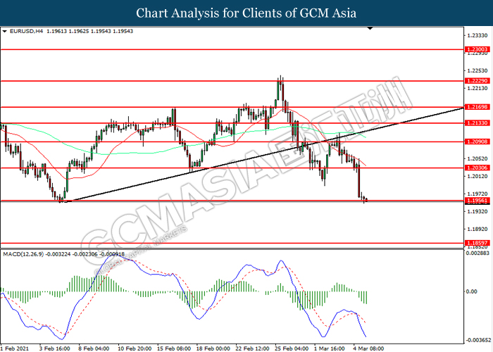 During late Asian session, the Euro which traded against the dollar and other currency pairs have plunged to new lows following recent release of downbeat inflation data from Eurozone. According to Eurostat, the latest Eurozone Retail Sales data for January have fell to -5.9%, worst then market expectation of 1.1%. Following the result, EUR investors are becoming more concerned about the outlook for the Eurozone’s economy, which appears to be heading for a double-dip recession. Added to this, EU’s delay in COVID-19 vaccine rollout earlier this year also continue to dampen market confidence towards the recovery in EU in the coming months. On the other hand, the pair was also pressured heavily by surging dollar strength due to recent comments from Fed Chairman Jerome Powell and higher U.S yield. Following all these factors, the pair have already experience huge selling pressure and causing a sharp drop in value. At the time of writing, EUR/USD fell 0.11% to 1.1960.