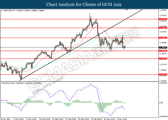 GBPUSD, H4: GBPUSD was traded lower while currently testing the support level at 1.3855. MACD which illustrated increasing bearish momentum suggest the pair to extend its losses after it successfully breakout below the support level.
