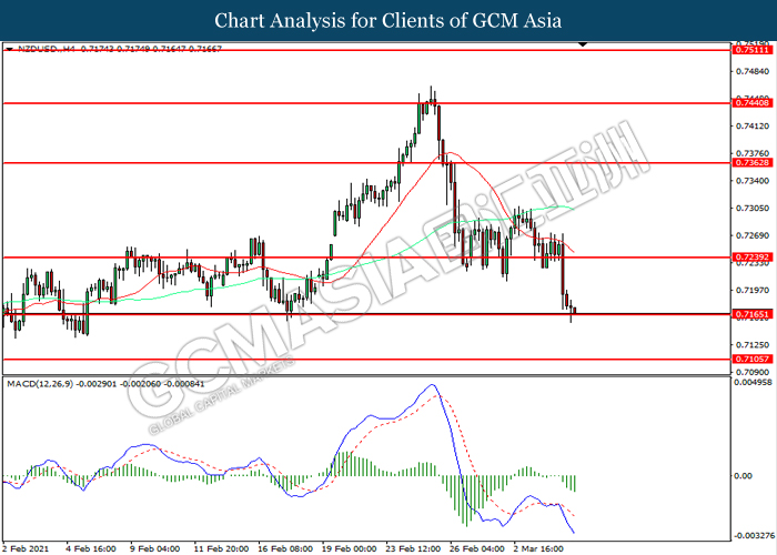 NZDUSD, H4: NZDUSD was traded lower while currently testing the support level at 0.7165. MACD which illustrated increasing bearish momentum suggest the pair to extend its losses after it successfully breakout below the support level.