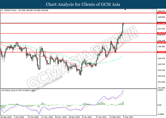 USDJPY, Daily: USDJPY was traded higher while currently testing the resistance level at 108.00. MACD which illustrated increasing bullish momentum suggest the pair to extend its gains after it successfully breakout above the resistance level.