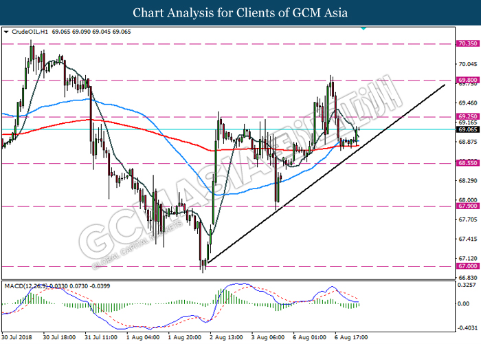 CrudeOIL, H1: The price of crude oil was traded higher following recent rebound from the trend line. MACD which display diminishing bearish momentum suggest the pair may extend its gains if it breaks above the resistance level 69.25.