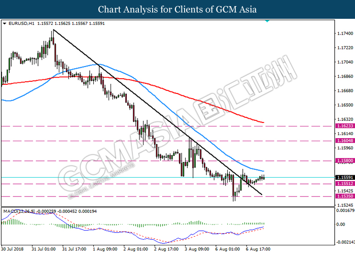 EURUSD, H1: EURUSD was traded higher following recent breakout above the trend line and also rebound from the support level 1.1550. Recent price action and MACD which illustrate ongoing bullish momentum suggest the pair may extend its gains toward the resistance level 1.1580.