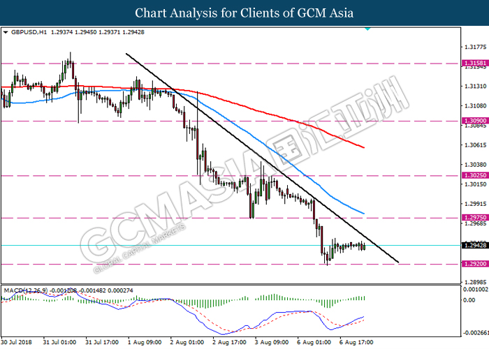 GBPUSD, H1: GBPUSD was traded higher following recent rebound from the support level 1.2920. Although MACD which display bullish signal with the golden cross formation, a breakout above the trend line is required to attain further confirmation.