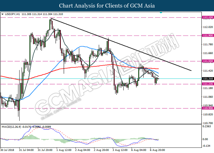 USDJPY, H1: USDJPY was traded lower which currently testing near the support level 111.20. Although MACD display signs of bearish signal, a breakout below the support level 111.20 is required for further confirmation.