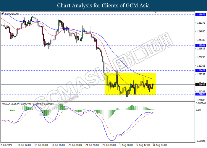 GBPUSD, H4: GBPUSD remain traded in a sideway channel. However, MACD which illustrate bullish bias signal suggest the pair to be traded higher in short term towards the resistance level 1.2245.