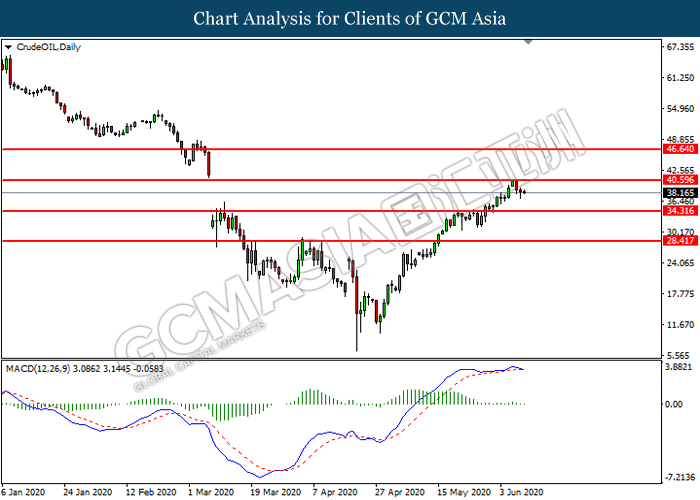 CrudeOIL, Daily: Crude oil price was traded lower following prior retracement from the resistance level at 40.60. MACD which illustrated diminishing bullish momentum suggest the commodity to extend its losses toward support level at 34.30.