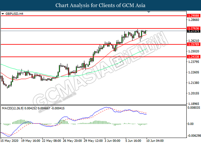 GBPUSD, H4: GBPUSD was traded higher while currently testing the resistance level at 1.2765. MACD which illustrated diminishing bearish momentum suggest the pair to extend its gains after it successfully breakout above the resistance level.