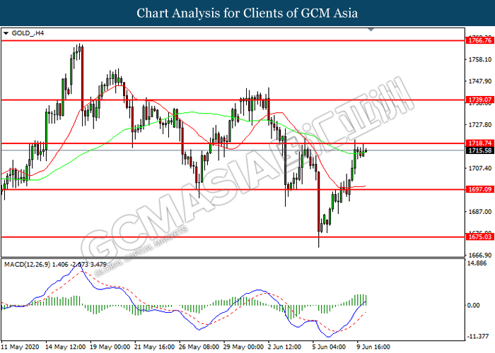 GOLD_, H4: Gold price was traded higher while currently testing the resistance level at 1718.75. However, MACD which illustrated diminishing bullish momentum suggest the commodity to be traded lower in short-term as technical correction.