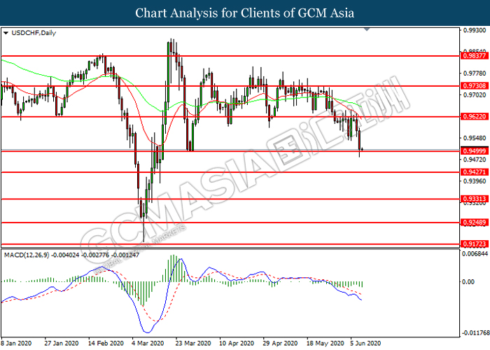 USDCHF, Daily: USDCHF was traded lower while currently testing the support level at 0.9500. MACD which illustrated increasing bearish momentum suggest the pair to extend its losses after it successfully breakout below the support level.