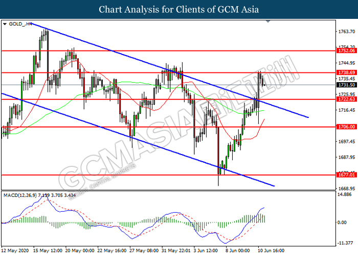 In the commodities market, crude oil price fell 1.02% to $38.45 per barrel as of writing amid weak recovery outlook continue to diminish market confidence. U.S. Federal Reserve said the world’s largest economy would shrink 6.5% this year and the unemployment rate would be at 9.3% at the end of 2020 in its first projections of the pandemic era. Besides that, the unexpected increase of crude oil supply also added further to the current negative sentiment. On the other hand, gold price rose 0.09% to $1732.73 a troy ounce at the time of writing following dollar weakness continue to drive the demand for safe-haven commodity.