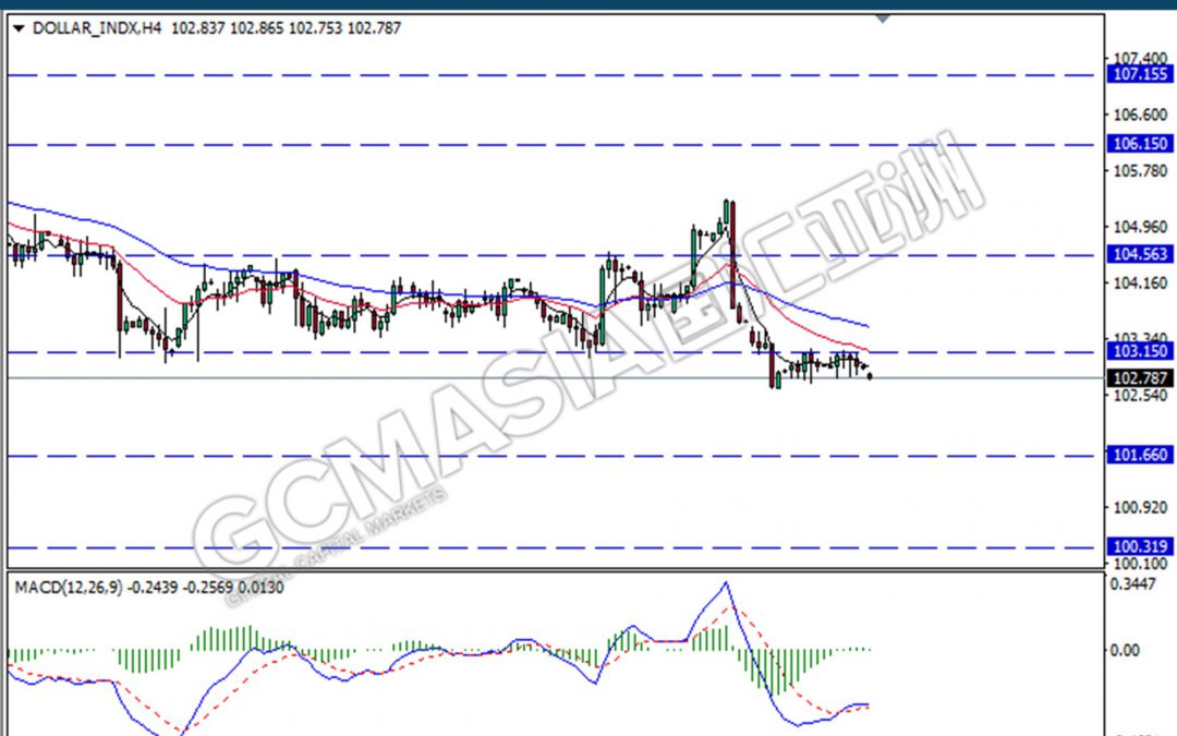 DOLLAR_INDX, H4: Dollar index was traded lower following the prior breakout below the previous support level at 103.15. MACD which illustrated decreasing in bullish momentum suggest the index to extend its losses toward support level at 101.65.