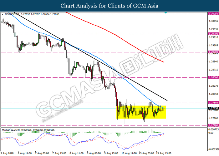 GBPUSD, H1: GBPUSD remain traded in a sideway channel while currently consolidate in a tight range. Although MACD which illustrate ongoing bullish momentum, a breakout above the resistance level 1.2780 is required to attain further confirmation.