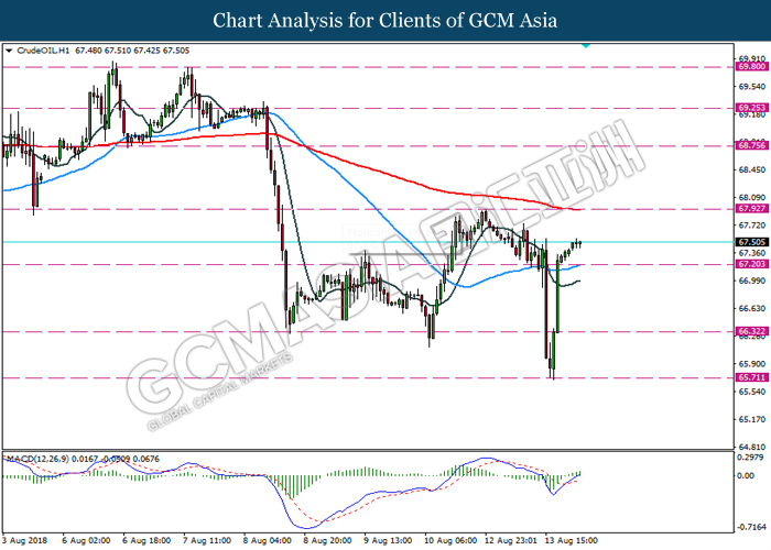 In the commodities markets, the price of crude oil gains 0.15% to $67.20 a barrel at the time of writing following with the release of OPEC Monthly Report. According to the statement in the monthly report, Saudi Arabia has reduce their productions for the month of July despite the government have promised to increase their output to compensate for expected fall of Iranian oil. However, global growth demand were expected to down 20k bpd to 1.4m bpd. Thus, investors will shift their attention towards the Crude Oil Inventories to determine further momentum for the black oil. On the other hand, the price of gold have rebound 0.15% to $1207.75 a troy ounce as of writing amid dollar strength that supported by the reports on Andrew Brunson release and also the progress of ongoing trade war between US and various countries.