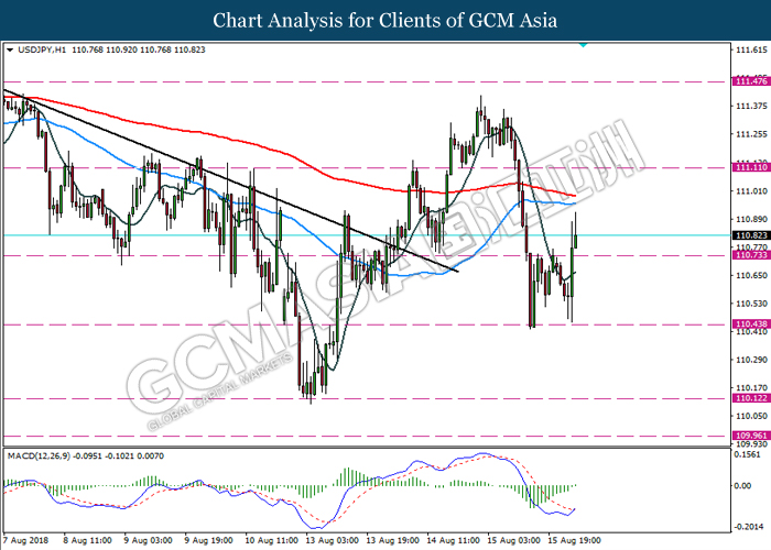 USDJPY, H1: USDJPY was traded higher following prior breakout above the resistance level 110.75. MACD which indicate diminished bearish signal also with golden cross formation suggest the pair to extend its gains towards resistance level 111.10