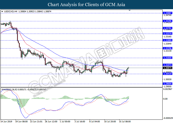 USDCAD, H4: USDCAD was traded higher following prior rebound from the support level 1.3040. MACD which illustrate bullish bias signal suggest the pair to extend its gains towards the resistance level 1.3105.