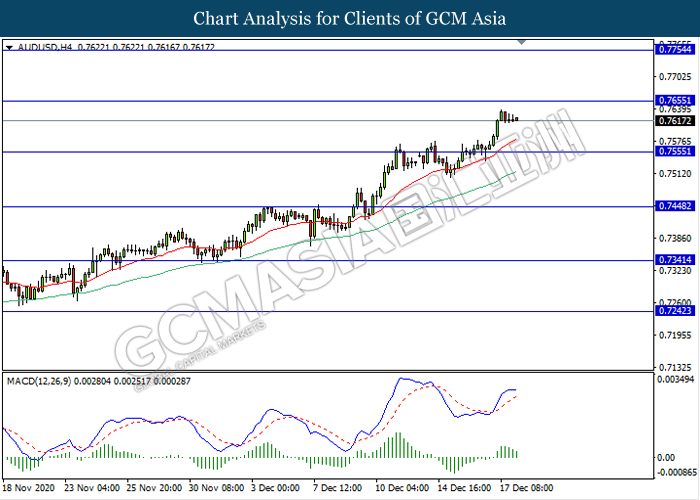 AUDUSD, H4: AUDUSD was traded higher while currently testing near the resistance level 0.7655. However, MACD which illustrate diminishing bullish momentum signal suggest the pair to experience a technical correction towards the support level 0.7555.