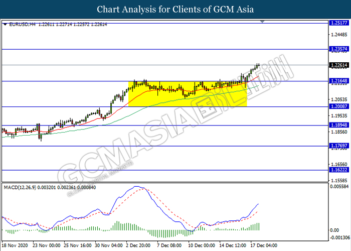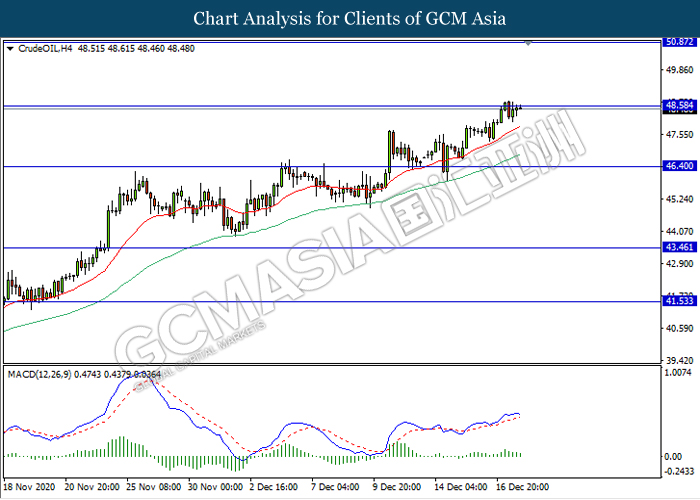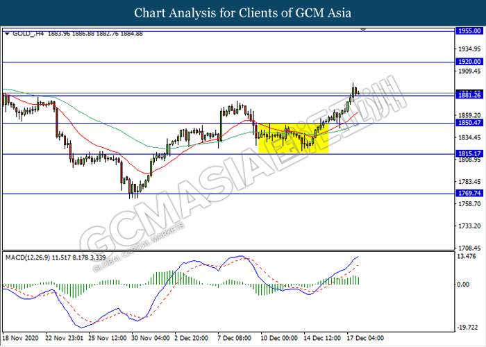 In the commodities market, crude oil price rose 0.011% to $48.48 per barrel as of writing following the prospect of U.S fiscal stimulus. U.S. lawmakers have moved closer towards the agreement on a $900 billion virus-relief spending package on Wednesday which could help recover U.S economy and boost economic activity and fuel consumption. On top of that, vaccine rollout also continues to keep the market in mood. On the other hand, gold price also soars 0.13% to $1884.36 a troy ounce following optimism on U.S stimulus have propelled the safe-haven metal.