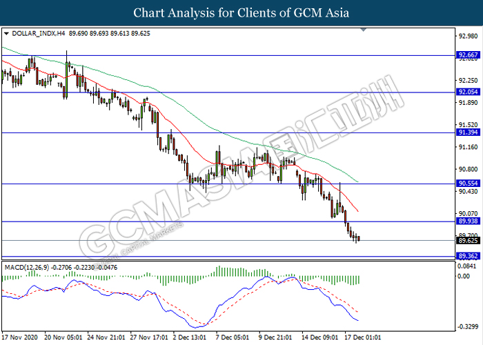 DOLLAR_INDX, H4: Dollar index was traded lower following prior breakout below the previous support level 89.95. MACD which illustrate ongoing bearish momentum signal suggest the dollar to extend its losses towards the next support level 89.35.