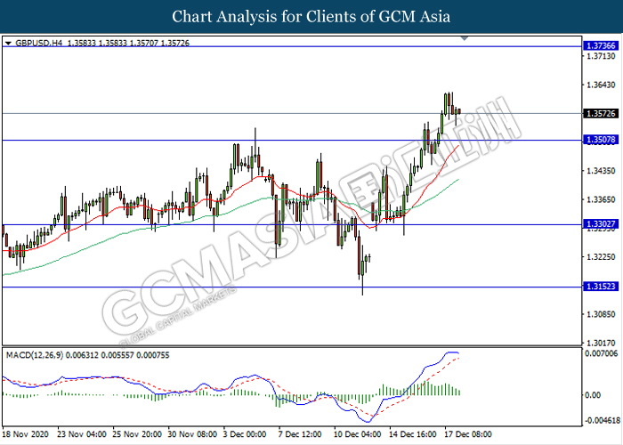 During early Asian session, the pound sterling which traded against the greenback and other currency pairs have pared some of its gains and fell following U.K Prime Minister warning on no-deal Brexit. Following latest development, U.K Prime Minster Boris Johnson have once again poured cod water on the trade deal and stated that a deal is unlikely to be reach unless the EU change its stance substantially. EU chief Ursula von de Leyen also acknowledging that there are some big difference remains, especially in fisheries. At the same time, Cabinet minister Michael Gove stated that the chances of the UK and EU agreeing on a post-Brexit trade deal are “less than 50%”. With the increasing risk of no deal Brexit, the pound sterling once again feeling the pressure and fell. Market will continue to monitor the development as the talks between two sides continue till Sunday which is the deadline set by EU. At the time of writing, GBP/USD slips 0.06% to $1.3571.