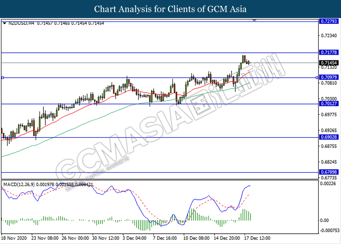 NZDUSD, H4: NZDUSD was traded lower following prior retracement from the resistance level 0.7175. MACD which illustrate diminishing bullish momentum signal suggest the pair to extend its retracement towards the support level 0.7095.