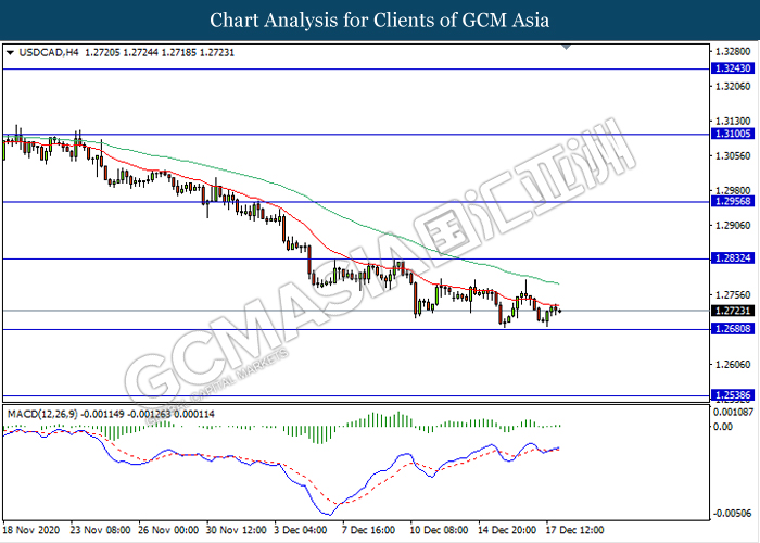 USDCAD, H4: USDCAD was traded higher following prior rebound from the support level 1.2680. MACD which illustrate bullish bias signal suggest the pair to extend its rebound towards the resistance level 1.2830.