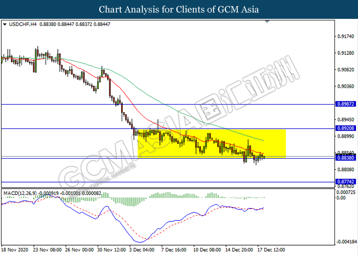 USDCHF, H4: USDCHF remain traded in a sideway channel while currently testing the support level 0.8840. However, MACD which illustrate bullish momentum signal with the formation of golden cross suggest the pair to be traded higher in short term towards the resistance level 0.8920.
