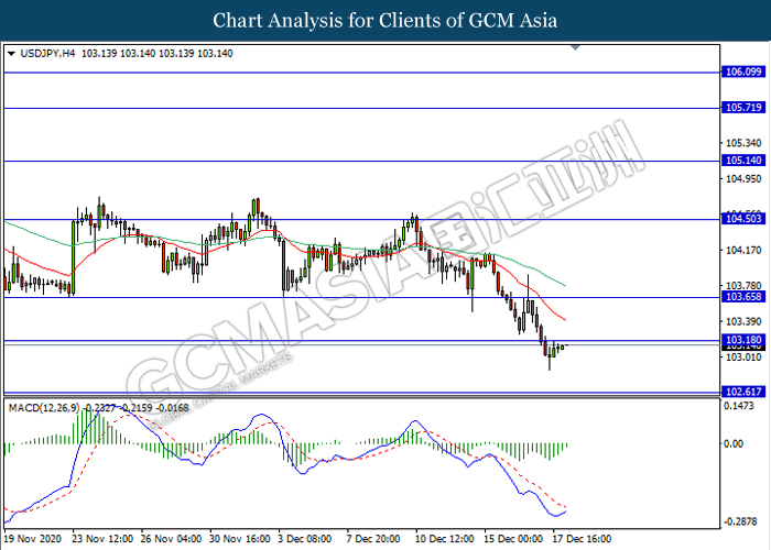 USDJPY, H4: USDJPY was traded higher while currently testing the resistance level 103.20. MACD which illustrate diminishing bearish momentum signal suggest the pair to extend its gains after it breaks above the resistance level.