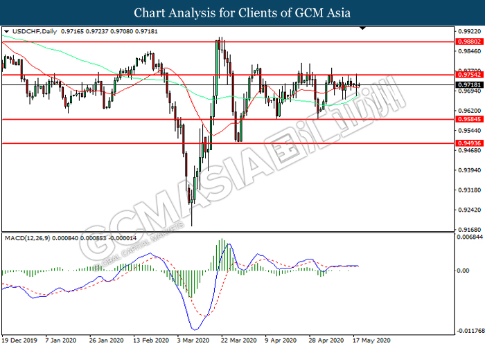 USDCHF, Daily: USDCHF was traded within a range while currently testing the resistance level at 0.9755 MACD which illustrated increasing bullish momentum suggest the pair to be traded higher after it successfully breakout above the resistance level.