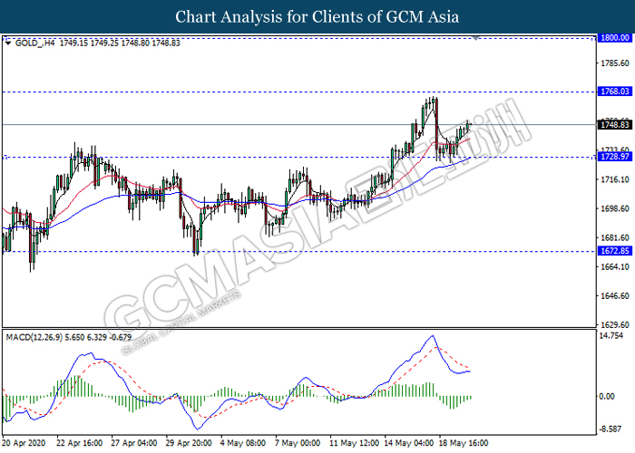 In the commodities market, the crude oil price surged 0.54% to $31.87 per barrels. The oil market edged higher following the positive oil inventory data was released. According to American Petroleum Institute, the U.S. API Weekly Crude Oil Stock had notched down from the previous reading of 7.580M to -4.800M, better than the market forecast at 2.400M while diminishing the fears upon the supply glut issue in the market. On the other hand, the gold market appreciated by 0.20% to $1748.15 per troy ounces due to the risk-off sentiment following a report from medical news website STAT claimed that the early data from Moderna Inc’s COVID-19 vaccine was inefficient.