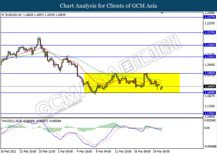 EURUSD, H4: EURUSD remain traded in a sideway channel while currently testing near the support level 1.1850. However, MACD which display bearish momentum signal with the recent formation of death cross suggest the pair to be traded lower after it breaks below the support level.