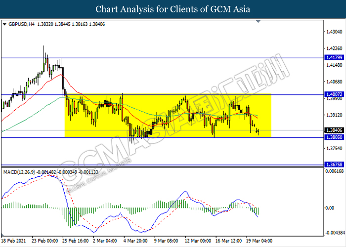 GBPUSD, H4: GBPUSD remain traded in a sideway channel while currently testing near the support level 1.3805. However, MACD which illustrate bearish bias signal with the formation of death cross suggest the pair to be traded lower after it breaks below the support level.