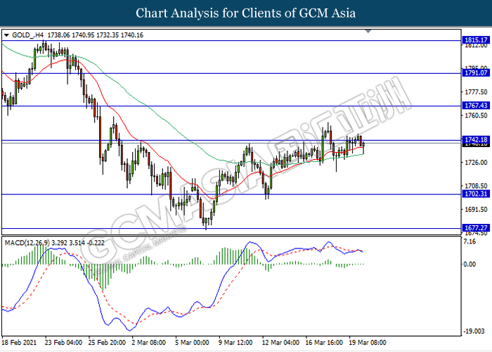 GOLD_, H4: Gold price was traded higher while currently testing the resistance level 1742.20. However, MACD which illustrate bearish bias signal with the formation of death cross suggest the commodity to experience a technical correction towards the support level 1702.30
